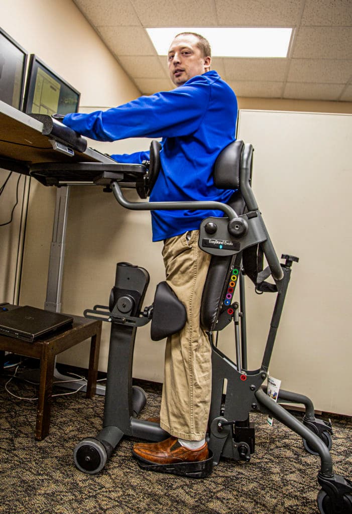 Tyler Thompson ha estado utilizando el bipedestador Evolv como una forma de estar de pie en el trabajo desde 2016. Decidió bipedestar unos 13 años después de tener una lesión medular. Tomó la decisión después de desarrollar una llaga por presión: Sabía que iba a volver al trabajo y sabía que no podía quedarme sentado todo el tiempo. Entonces, me planteé la cuestión de cómo iba a salir de la postura de sedestación.