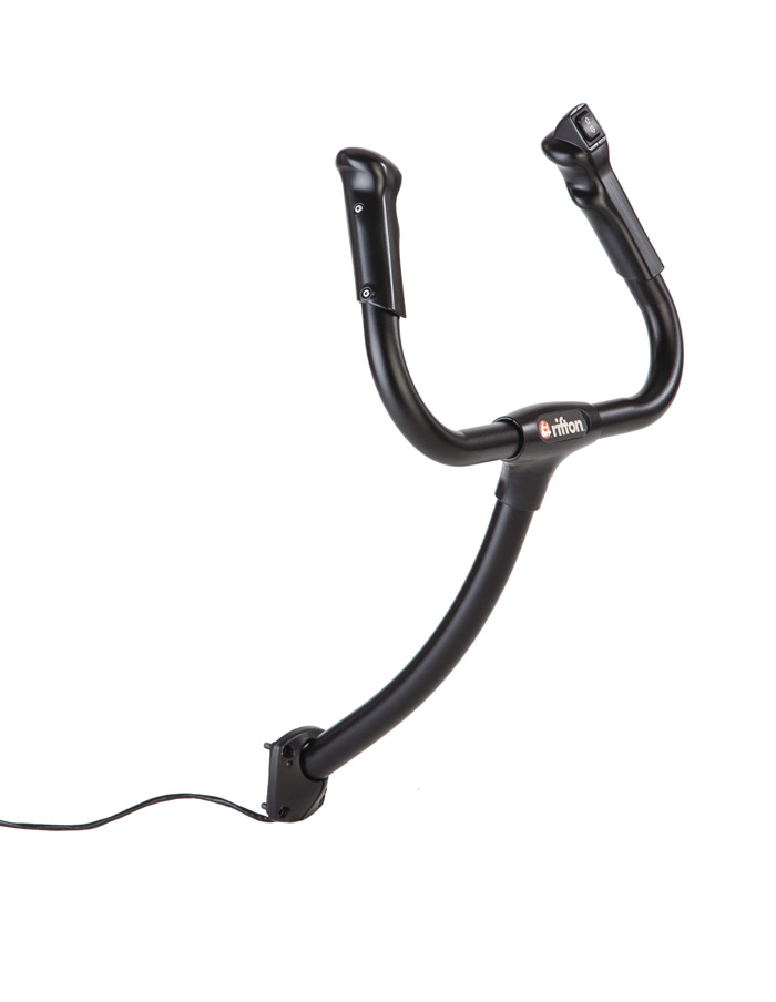 L’empunyadura davantera del caminador E-Pacer permet que un cuidador maniobri i guiï l’E-Pacer. Inclou un interruptor per ajustar l’alçada del suport del cos.