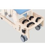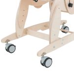 La base mòbil de fusta contraxapada, amb reposapeus i cingles, permet traslladar la cadira d’un lloc a l’altre.