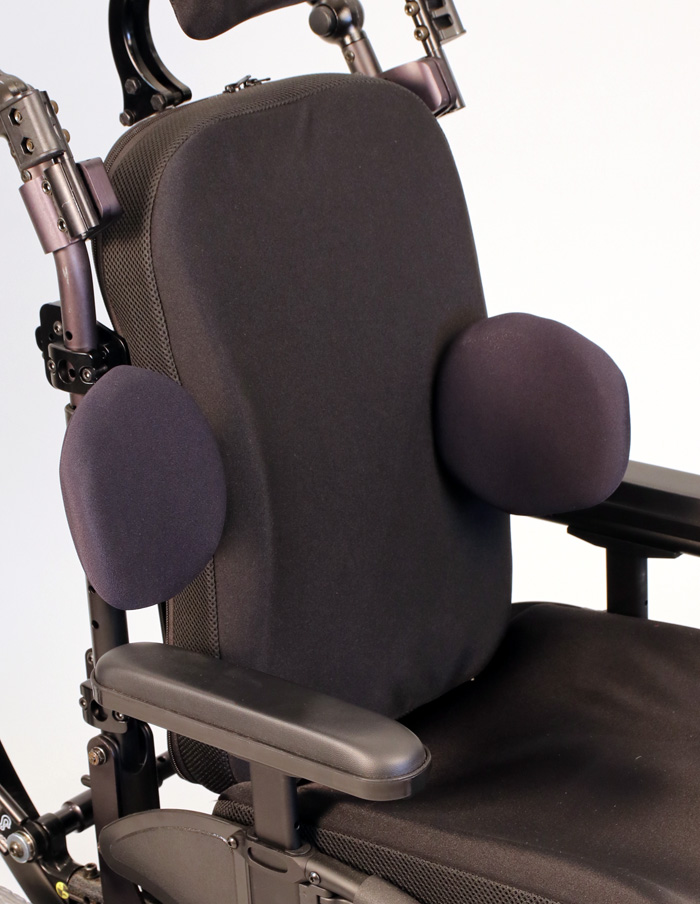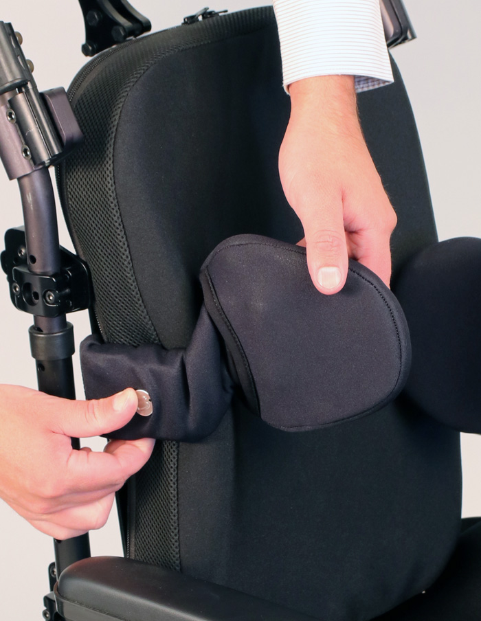 El suport abatible axial per als controls toràcics de la cadira de rodes és ajustable en amplada, profunditat i múltiples angles, i incorpora un botó d’obertura fàcil per deixar lliure al lateral quan es realitzin transferències.