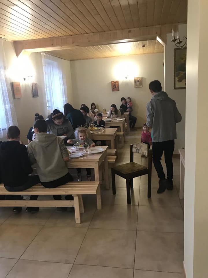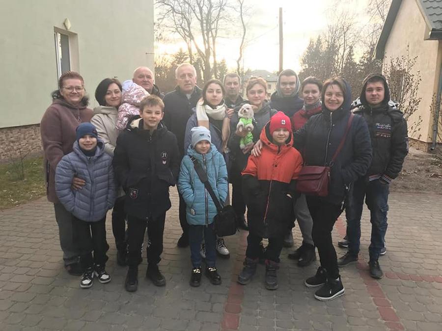 Fotos: el Padre Jan Buras dando la bienvenida a nuevas personas, entre ellas a una familia de Donetsk con cuatro niños.
