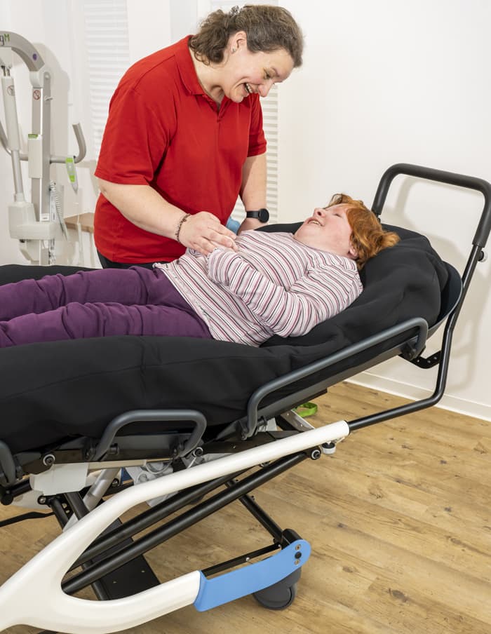 Nuevo modelo de Tina, un chasis o base móvil diseñado para permitir la colocación de lechos posturales. El sistema de elevación mediante un pistón eléctrico facilita los cuidados y las actividades terapéuticas.