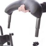 La parte superior del respaldo está a 38 cm del asiento. El respaldo se desmonta con dos perillas y permite el acceso trasero para transferencias de pacientes.
