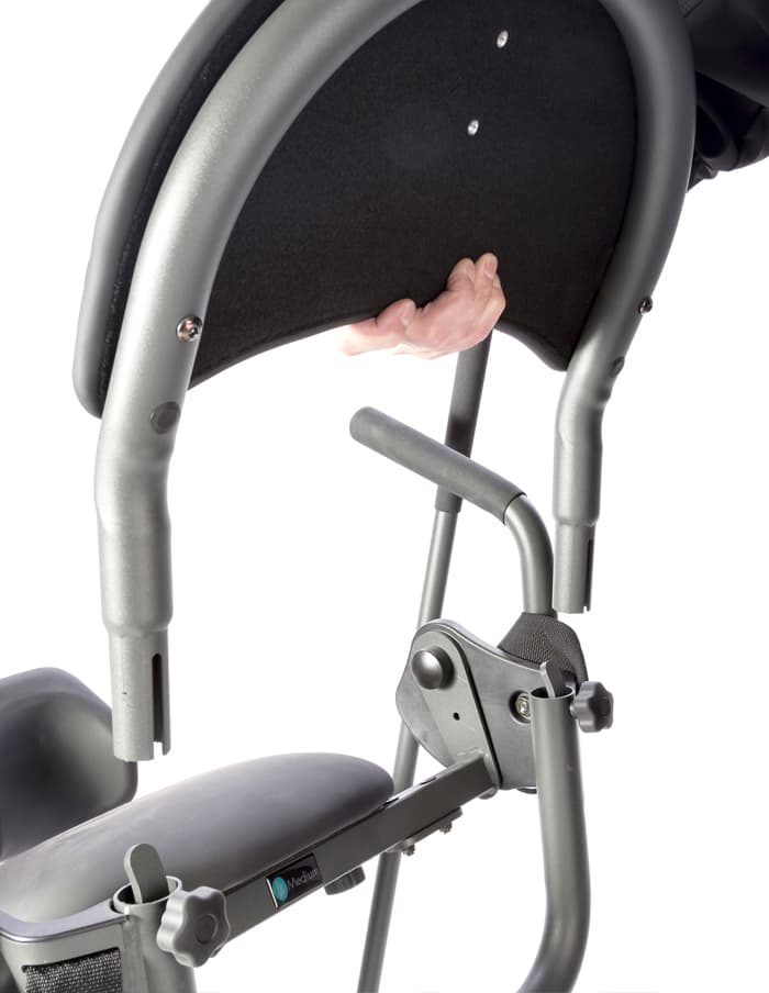 La parte superior del respaldo está a 48 cm del asiento. El respaldo extraíble se desbloquea con dos perillas y permite el acceso trasero para transferencias de pacientes.