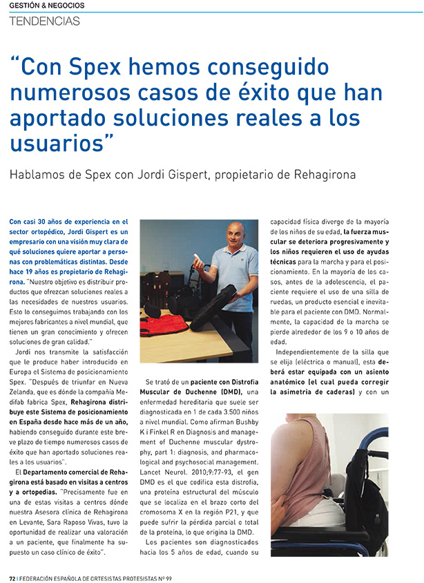 El último número de la revista Ortoprotésica incorpora un reportaje en el que Jordi Gispert, propietario de Rehagirona, expone un caso clínico de éxito con el Sistema de posicionamiento Spex. El caso recoge el resultado conseguido por Sara Raposo Vivas, Asesora clínica de Rehagirona en Levante, en una visita a un centro.